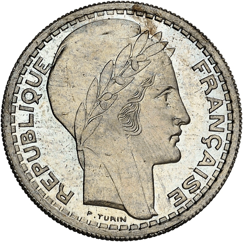 - Gouvernement provisoire de la République française (1944-1946). Essai de 5 francs Turin en bronze-nickel, petit module, Frappe spéciale (SP) 1945, Paris.