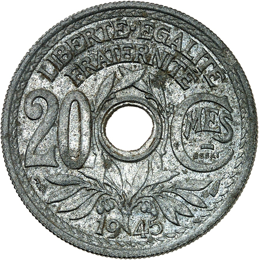 - Gouvernement provisoire de la République française (1944-1946). Essai de 20 centimes Lindauer, Frappe spéciale (SP) 1945, Paris.