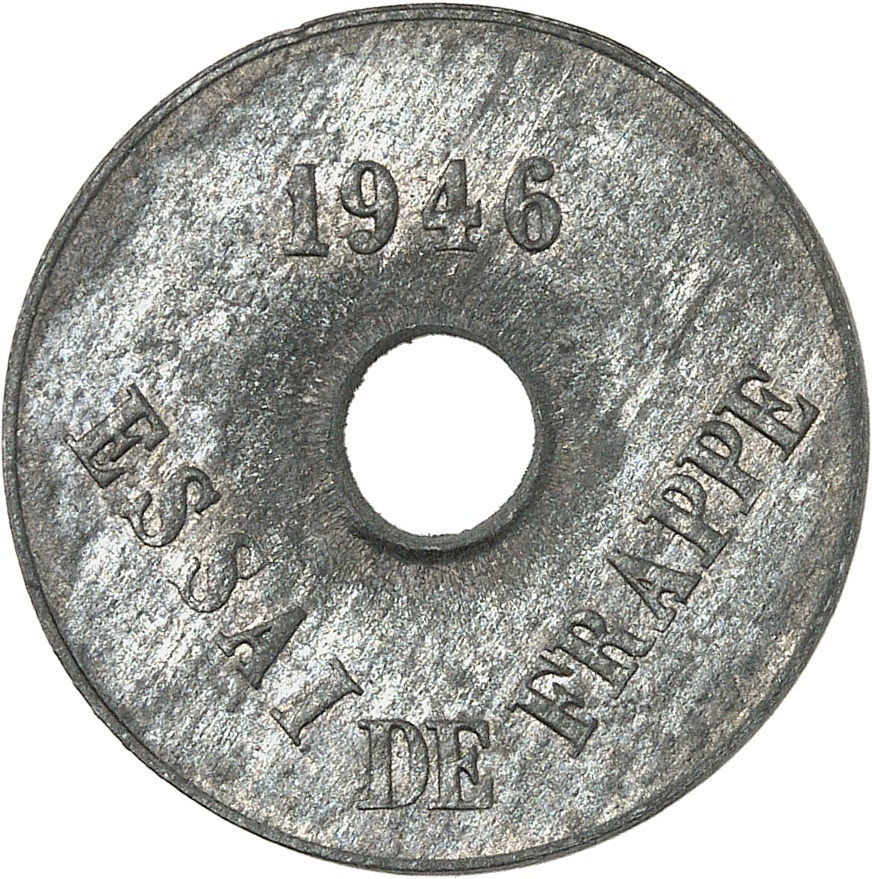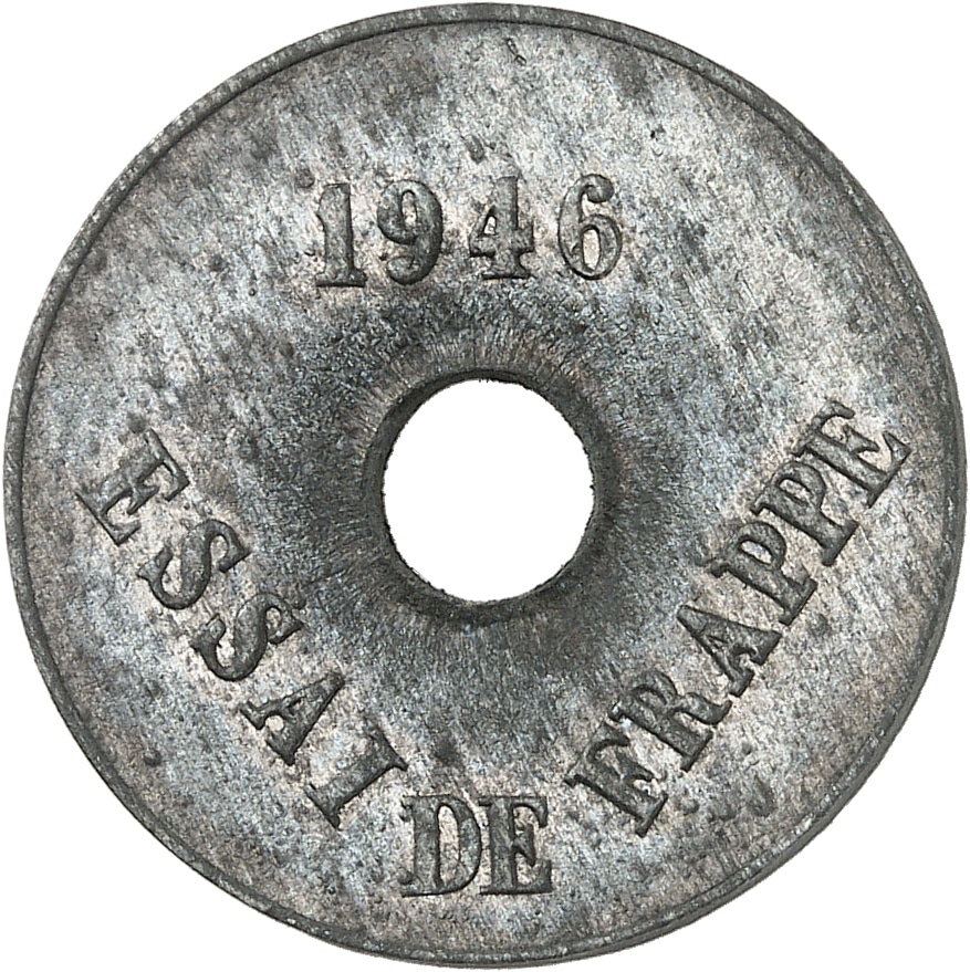 - Gouvernement provisoire de la République française (1944-1946). Essai de frappe au module de 20 centimes, deux faces identiques, Frappe spéciale (SP) 1946, Paris.