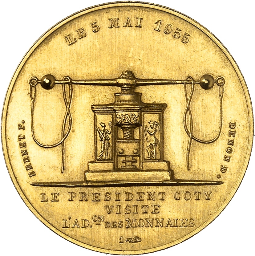 Rv. LE 5 MAI 1955. Le balancier de Louis XIV de la Monnaie de Paris (construit en 1699). Autour, les signatures BRENET F. et DENON D. À l'exergue : LE PRESIDENT COTY/ VISITE/ L'ADon. DES MONNAIES/ 1(corne).