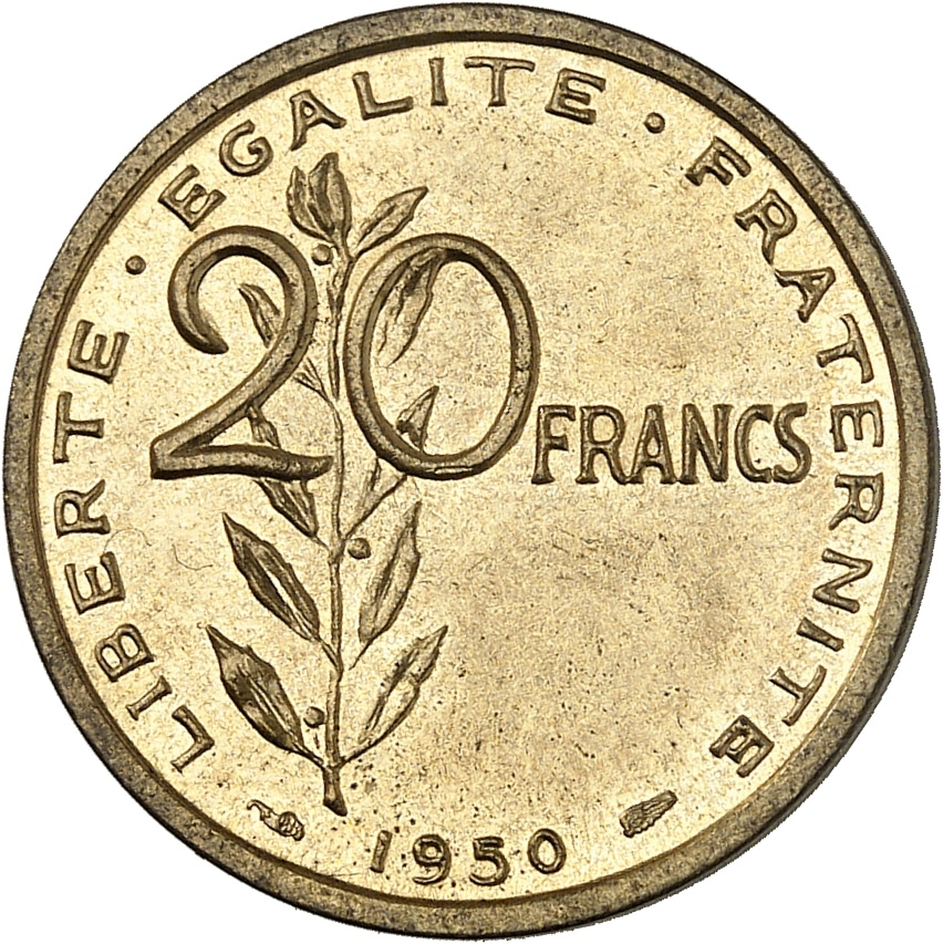 - IVe République (1947-1958). Présérie de 20 francs (sans ESSAI), concours de 1950, par A. Guzman, Frappe spéciale (SP) 1950, Paris.