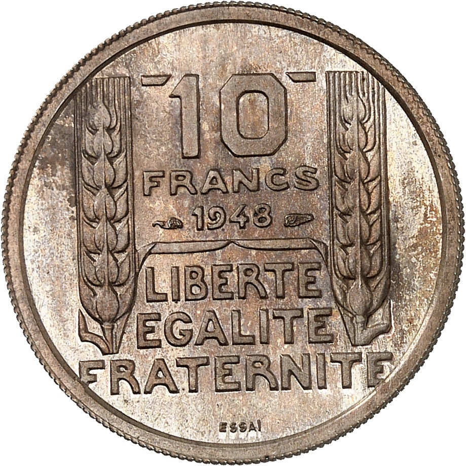- IVe République (1947-1958). Essai de 10 francs Turin, sans grènetis intérieurs et de petit module, Frappe spéciale (SP) 1948, Paris.