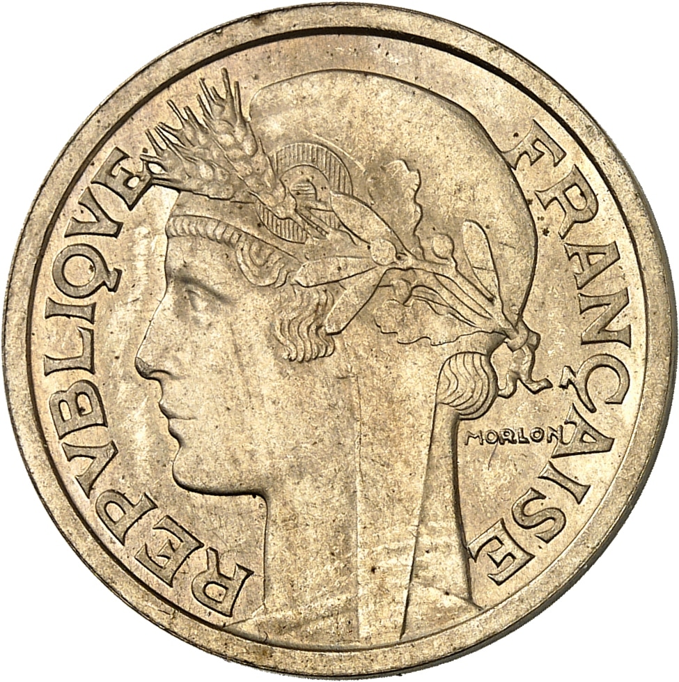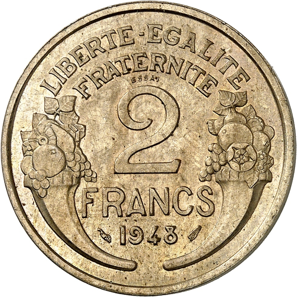- IVe République (1947-1958). Essai de 2 francs Morlon en cupro-nickel, Frappe spéciale (SP) 1948, Paris.