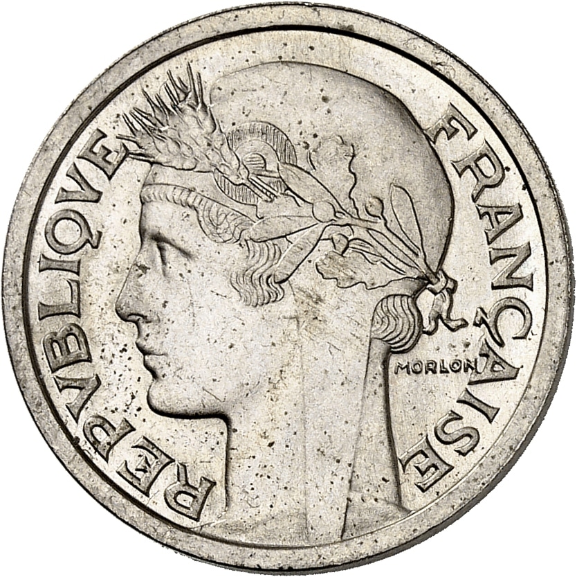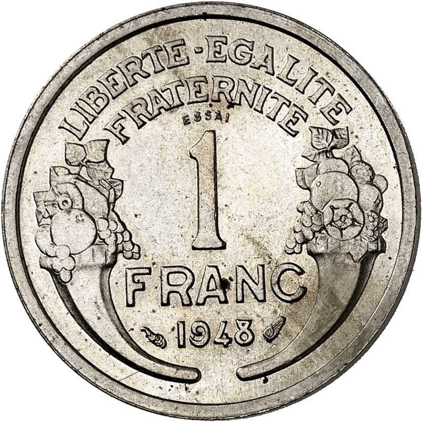 - IVe République (1947-1958). Essai de 1 franc Morlon en cupro-nickel, de poids 6 g, Frappe spéciale (SP) 1948, Paris.