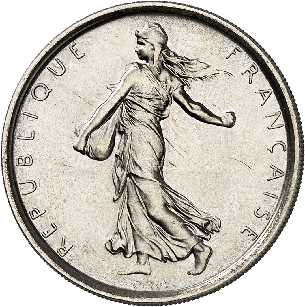 Av. REPUBLIQUE FRANÇAISE. La Semeuse à gauche, avec le soleil levant, marchant et semant à contre-vent ; signature O. ROTY.