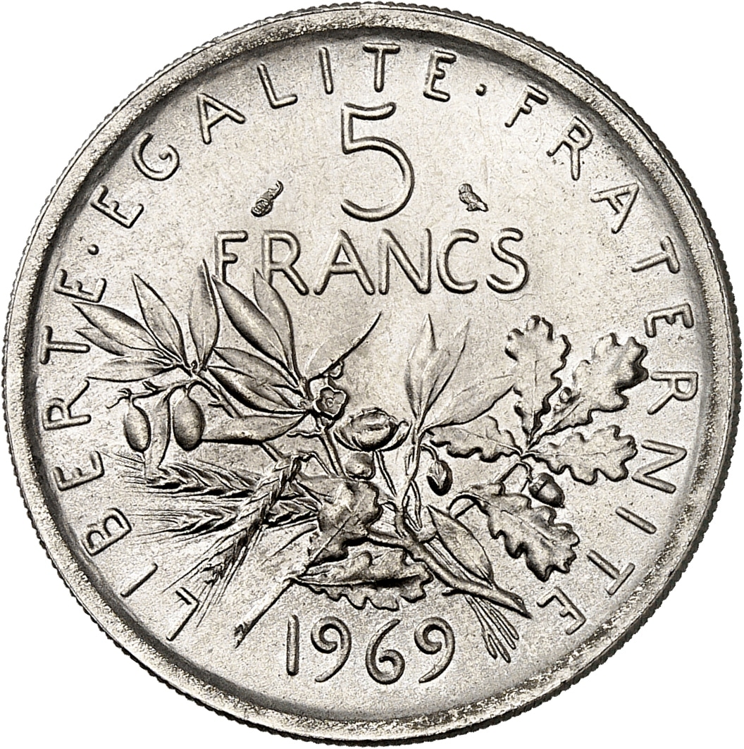 - Ve République (1958 à nos jours). Présérie de 5 francs Semeuse en cupro-nickel, Frappe spéciale (SP) 1969, Paris.