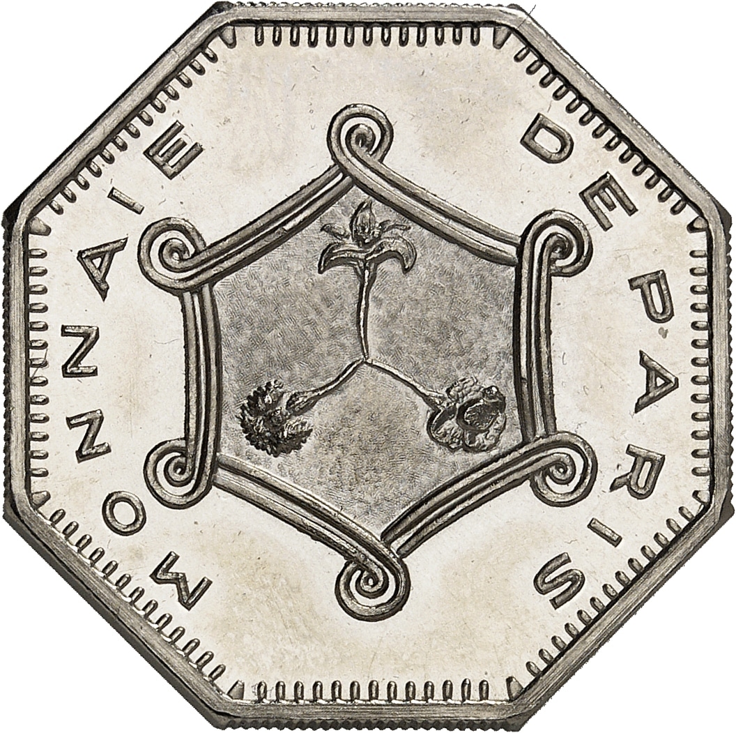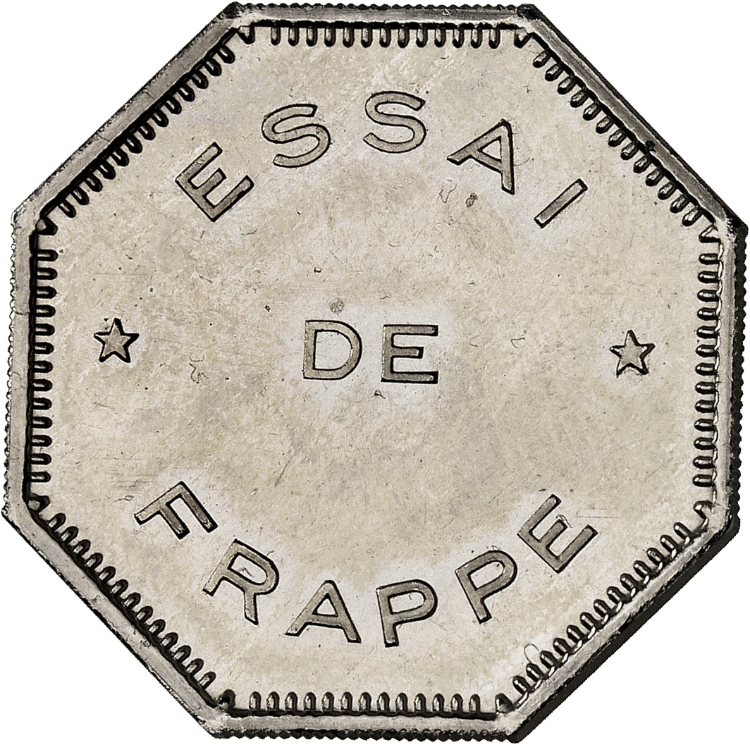 - Ve République (1958 à nos jours). Essai de frappe octogonal (au module de 2 francs) en nickel, Frappe spéciale (SP) ND (1977), Paris.