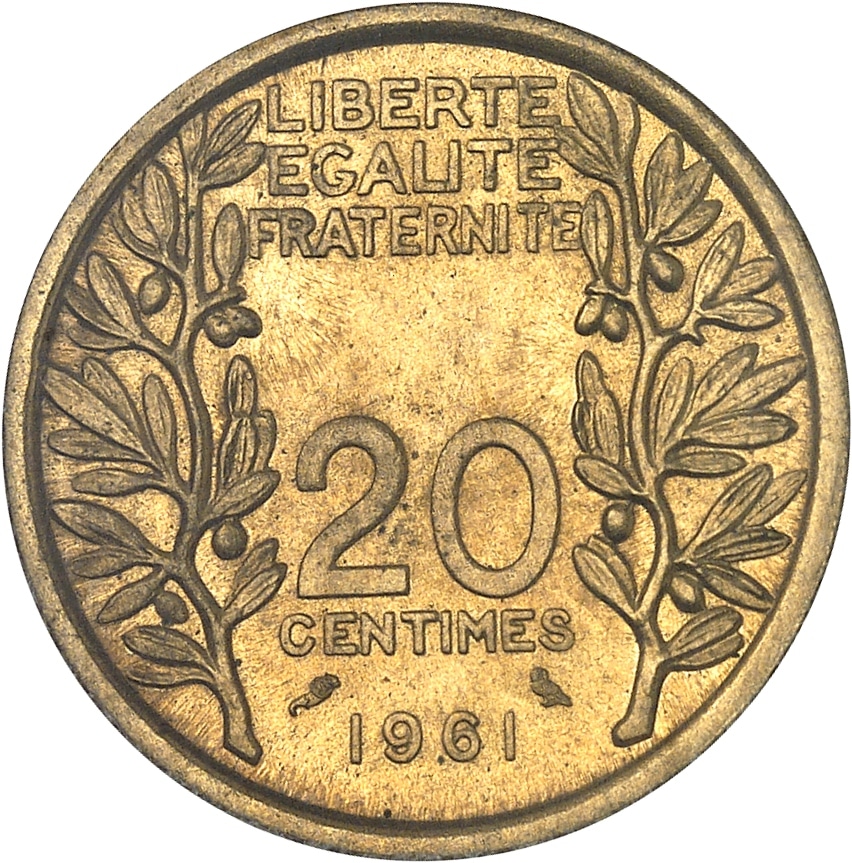 - Ve République (1958 à nos jours). Présérie de 20 centimes, concours de 1961, par Lagriffoul [avers adopté] 1961, Paris.