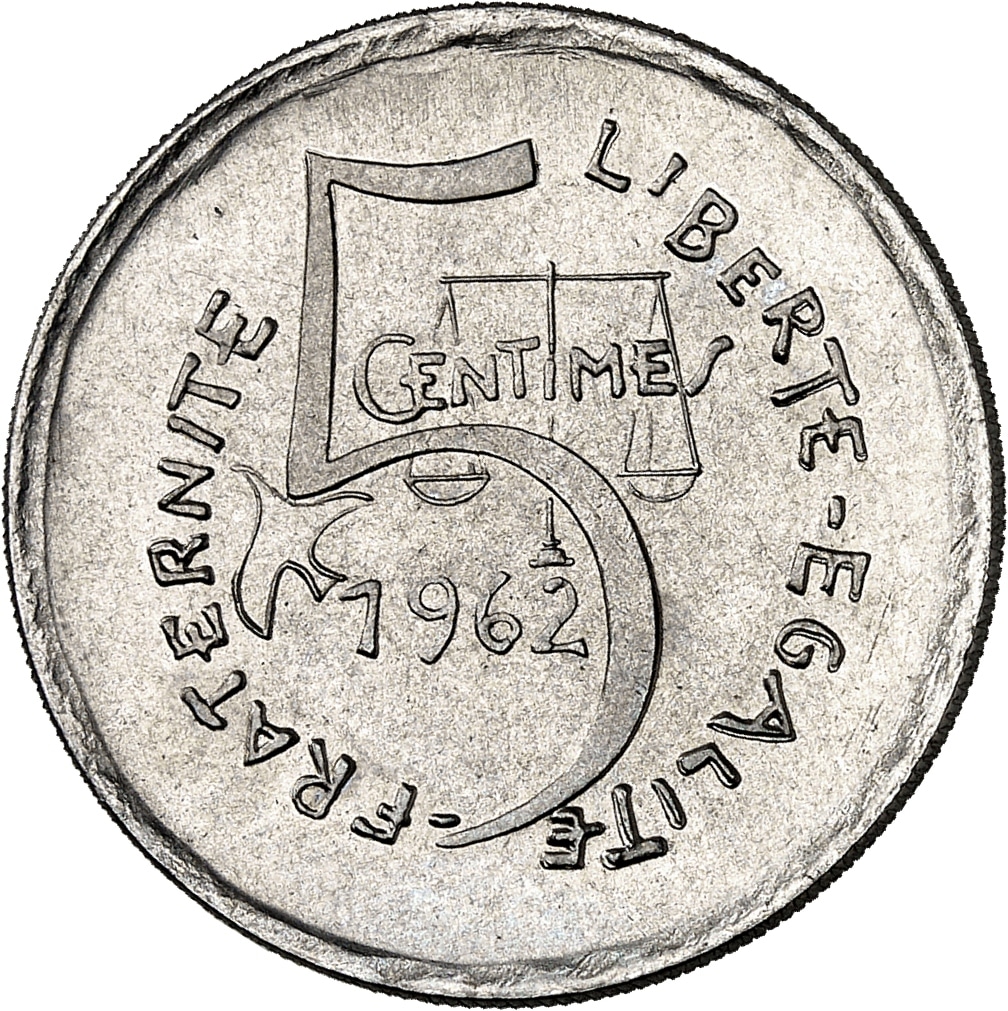 - Ve République (1958 à nos jours). Épreuve de 5 centimes, deuxième projet de R. Joly, grand module, Frappe spéciale (SP) 1962, Paris.