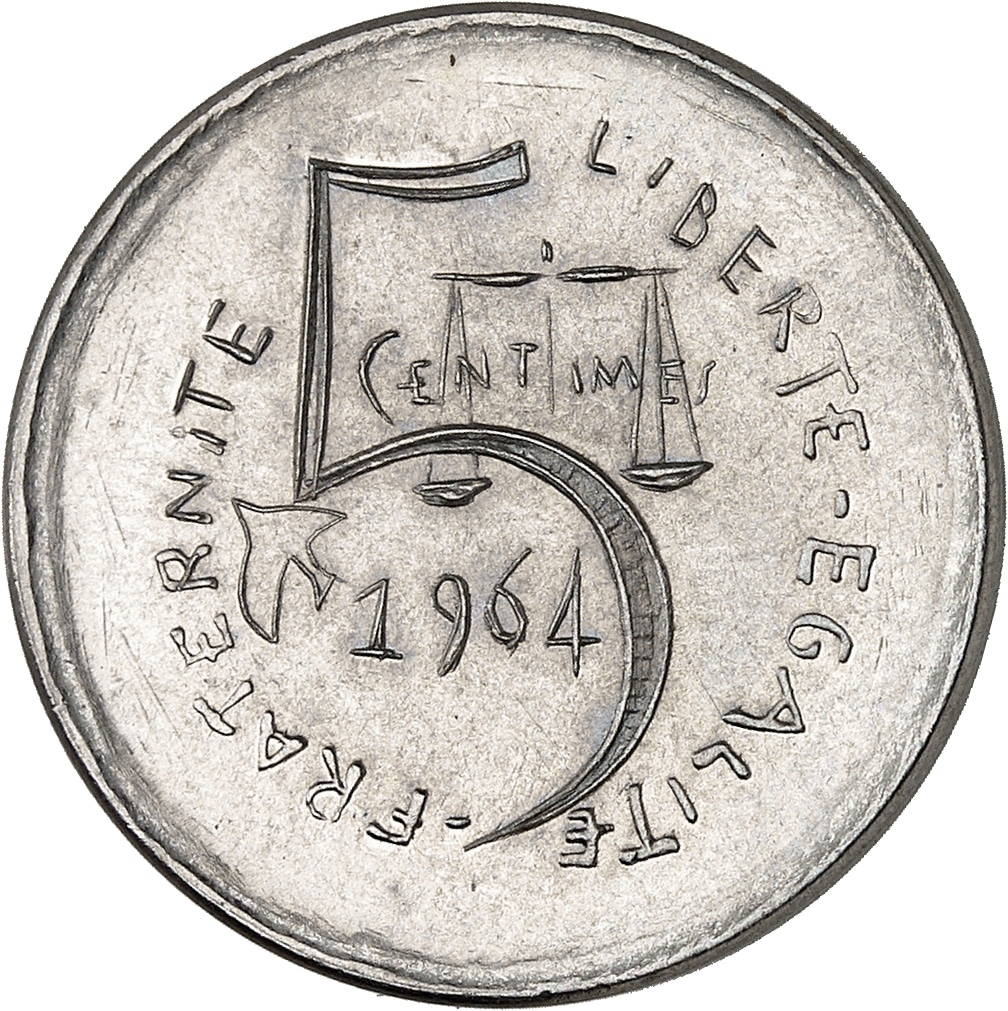 - Ve République (1958 à nos jours). Épreuve de 5 centimes, deuxième projet de R. Joly, grand module, Frappe spéciale (SP) 1964, Paris.