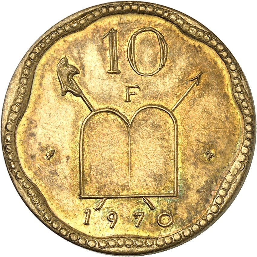 - Ve République (1958 à nos jours). Épreuve privée (sans ESSAI) de 10 francs aux Tables de la Loi, par R. Joly, Frappe spéciale (SP) 1970, Paris.