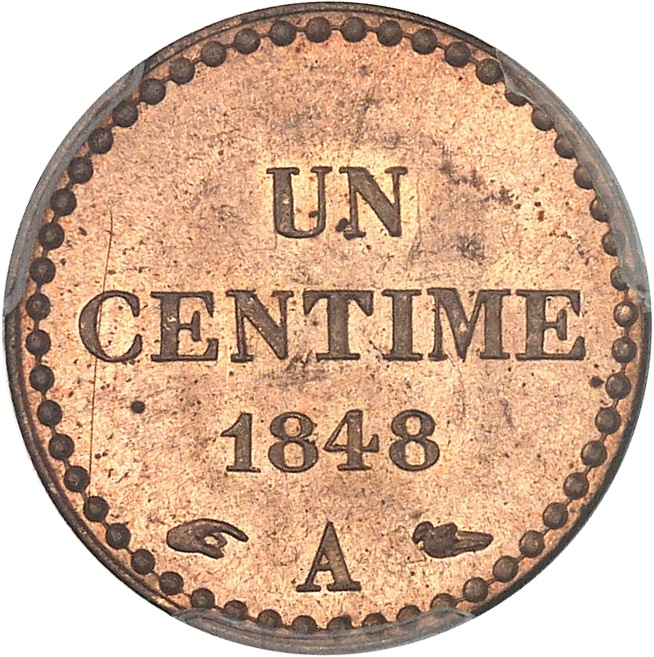- IIe République (1848-1852). Un centime Dupré 1848, A, Paris.