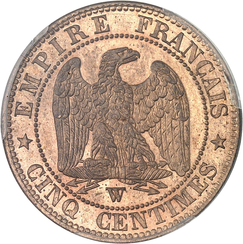 Rv. EMPIRE FRANÇAIS / * CINQ CENTIMES *. Aigle éployée, la tête à droite, sur un foudre ; au-dessous (atelier).