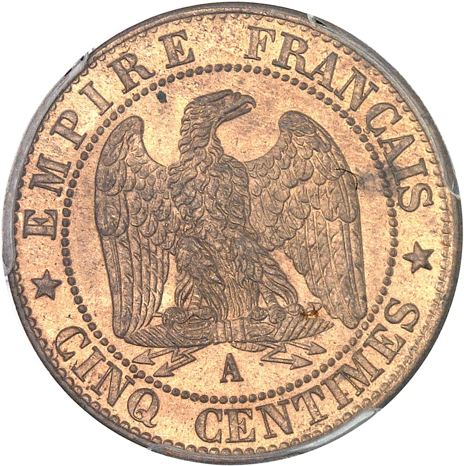 Rv. EMPIRE FRANÇAIS / * CINQ CENTIMES *. Aigle éployée, la tête à droite, sur un foudre ; au-dessous (atelier).