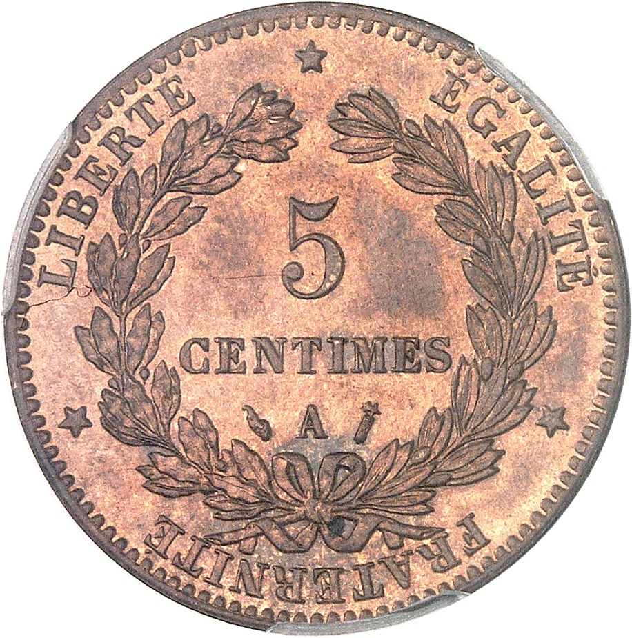 Rv. LIBERTE. EGALITE. FRATERNITE. Dans une couronne formée de deux branches, sous une étoile : 5 CENTIMES (différent) (atelier) (différent).