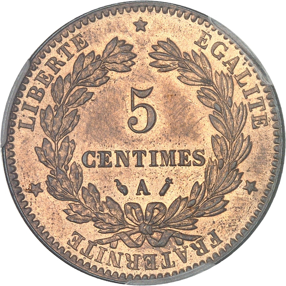 Rv. LIBERTE. EGALITE. FRATERNITE. Dans une couronne formée de deux branches, sous une étoile : 5 CENTIMES (différent) (atelier) (différent).