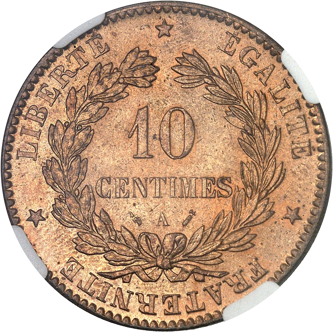 Rv. LIBERTÉ. ÉGALITÉ. FRATERNITÉ. Dans une couronne formée de deux branches, sous une étoile : 10 CENTIMES (différent) (atelier) (différent).