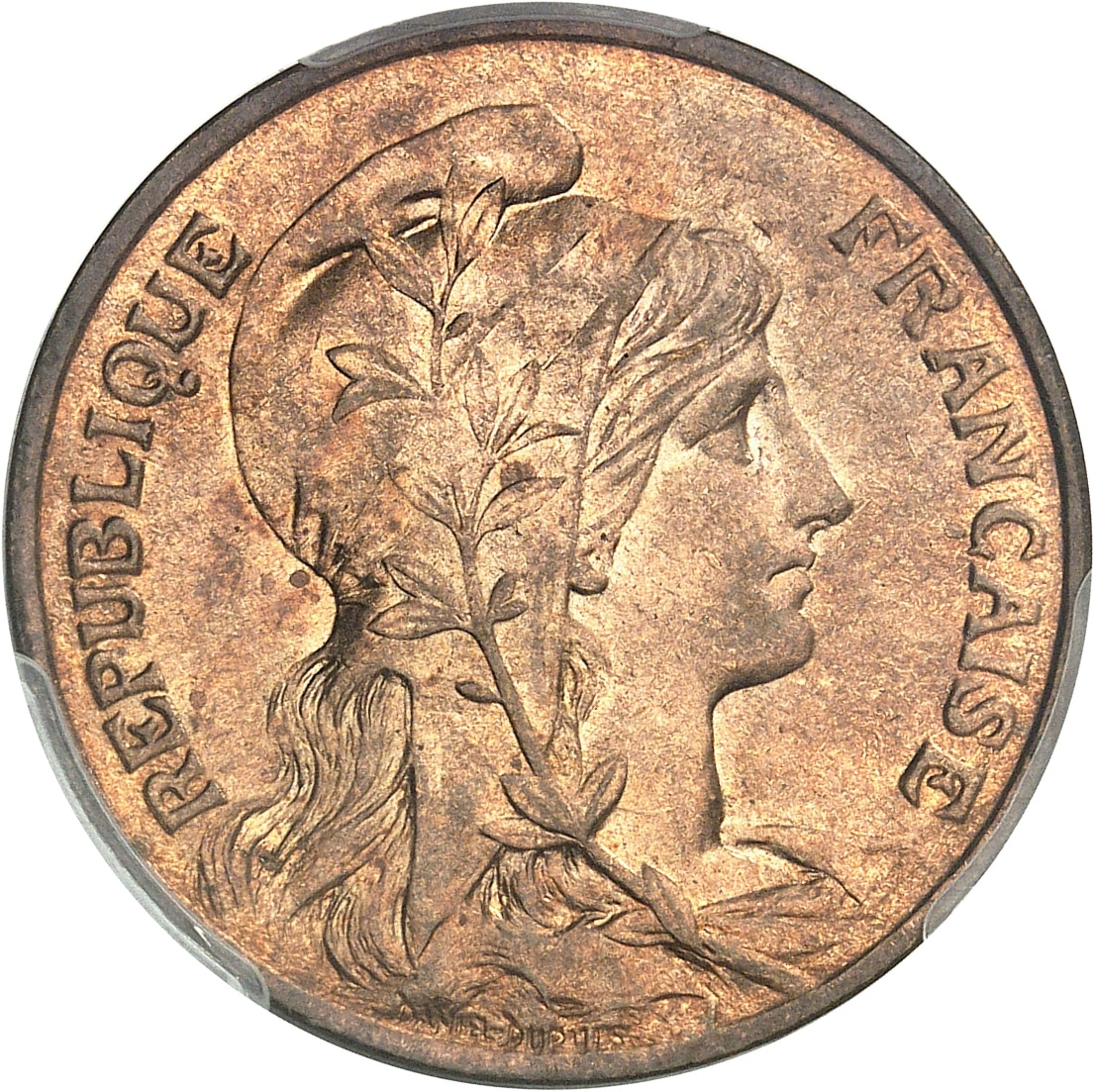 Av. REPUBLIQUE FRANÇAISE. Buste de la République à droite, avec bonnet phrygien et branche d’olivier, signature DANIEL-DUPUIS.