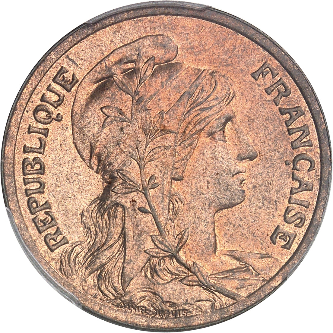 Av. REPUBLIQUE FRANÇAISE. Buste de la République à droite, avec bonnet phrygien et branche d’olivier, signature DANIEL-DUPUIS.