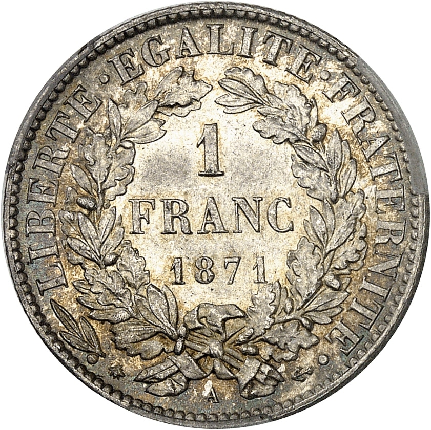 - Gouvernement de Défense Nationale (1870-1871). 1 franc Cérès 1871, A, Paris.