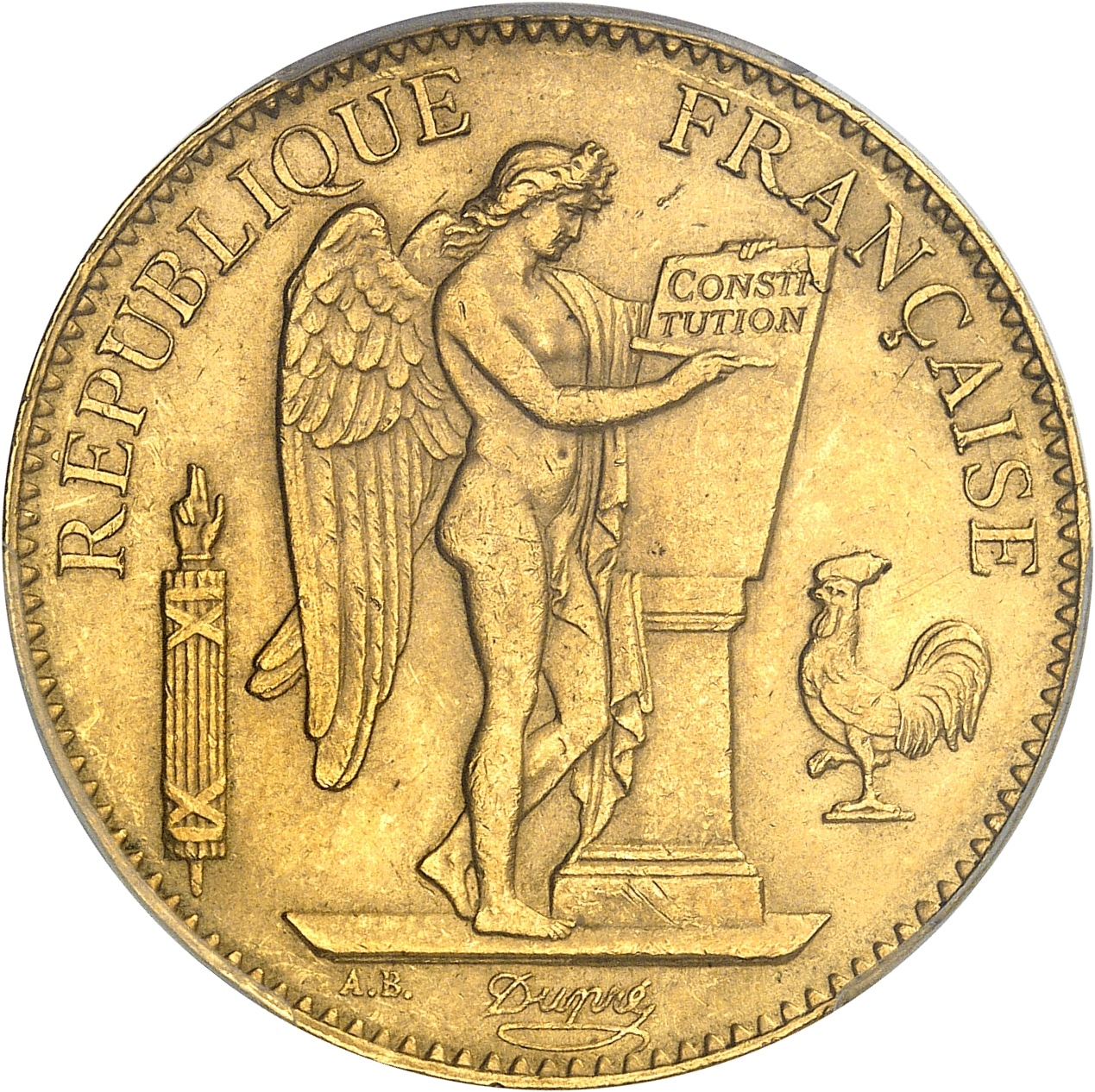 Av. RÉPUBLIQUE FRANÇAISE. Génie ailé de la République debout à droite, gravant le mot CONSTITUTION sur une table, accosté d’un faisceau à gauche et d’un coq à droite ; à l’exergue : signatures A.B. et Dupré.