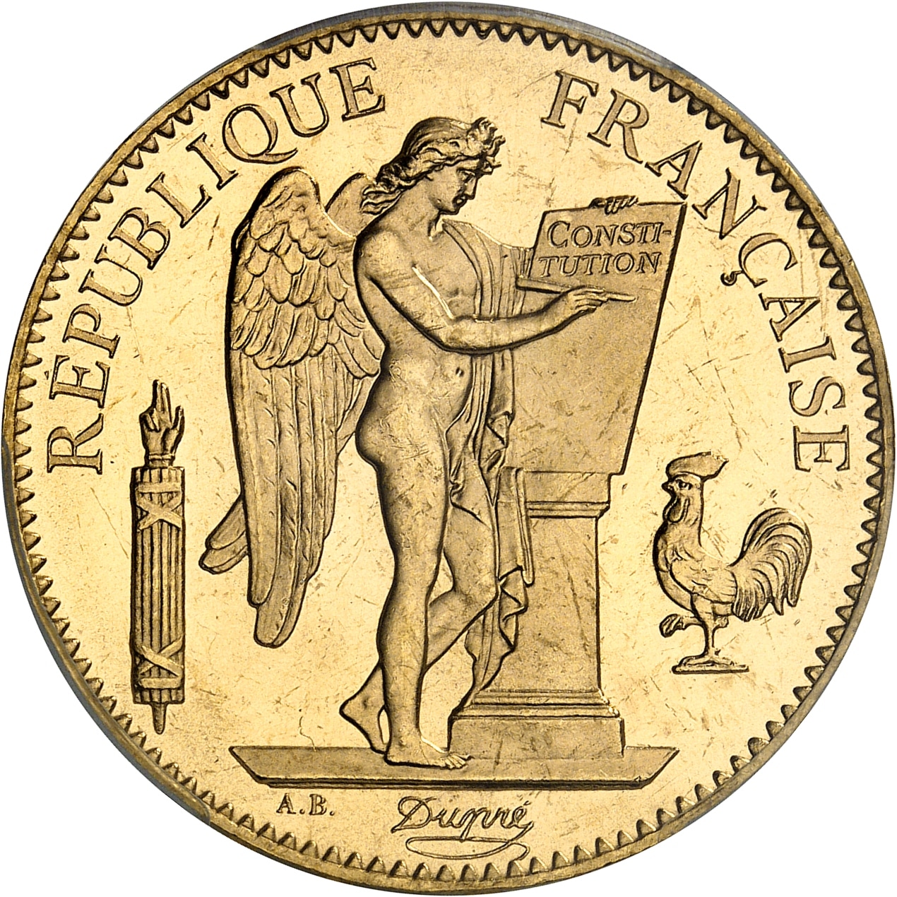 Av. RÉPUBLIQUE FRANÇAISE. Génie ailé de la République debout à droite, gravant le mot CONSTITUTION sur une table, accosté d’un faisceau à gauche et d’un coq à droite ; à l’exergue : signatures A.B. et Dupré.