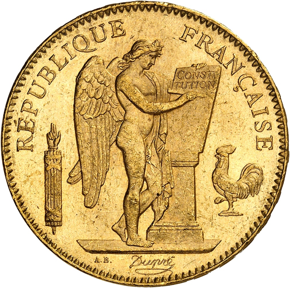 Av. RÉPUBLIQUE FRANÇAISE. Génie ailé de la République debout à droite, gravant le mot CONSTITUTION sur une table, accosté d’un faisceau et d’un coq ; à l’exergue : signatures A.B. et Dupré.