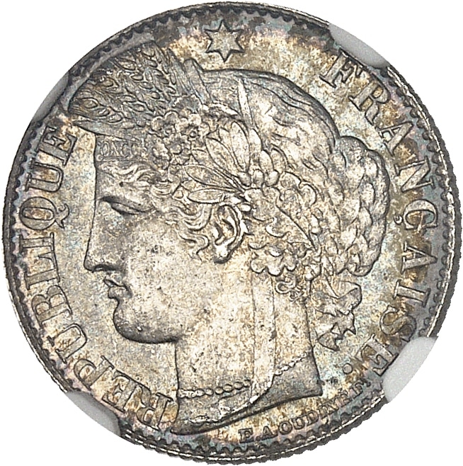 Av. RÉPUBLIQUE FRANÇAISE. Tête de la République à gauche en Cérès, sous une étoile, au-dessous signature E. A. OUDINÉ. F.