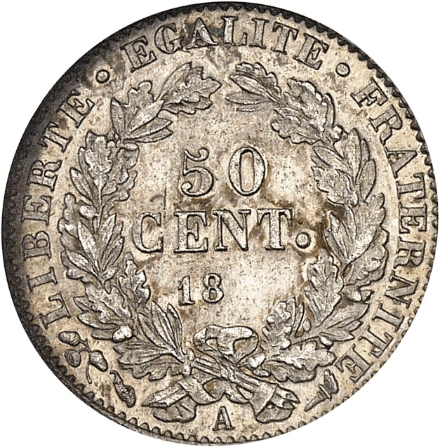 - IIIe République (1870-1940). Essai de 50 centimes Cérès, date incomplète 18-- (1896), A, Paris.