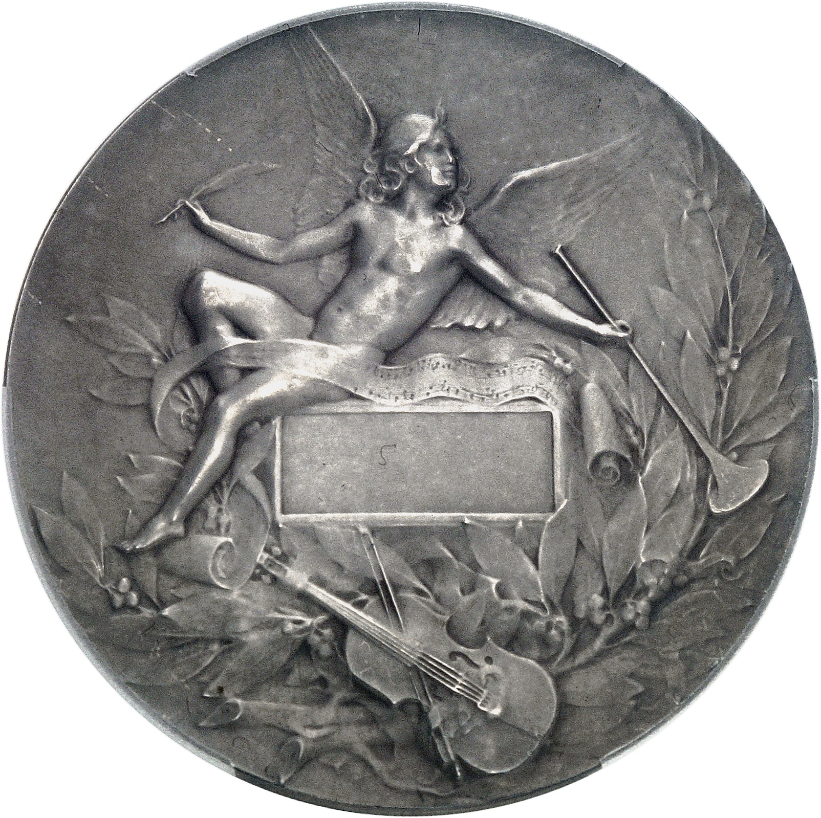 Rv. Un ange tenant une plume et une trompette regarde derrière lui, une partition déroulée sur sa cuisse. Il est assis sur un cartouche au-dessous duquel un violon est posé sur une couronne de lauriers.