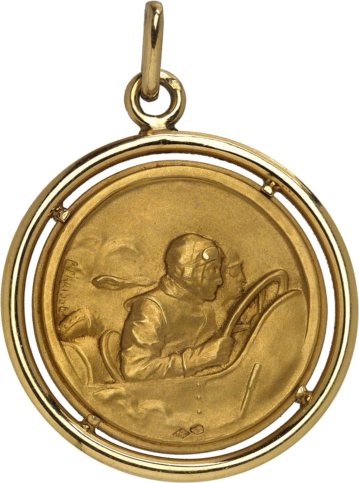 Médaillette sur flan mat, montée dans un cerclage en or brillant, avec poinçons de fabricant et hure sur la bélière. Unique et historique. Superbe à Fleur de coin.