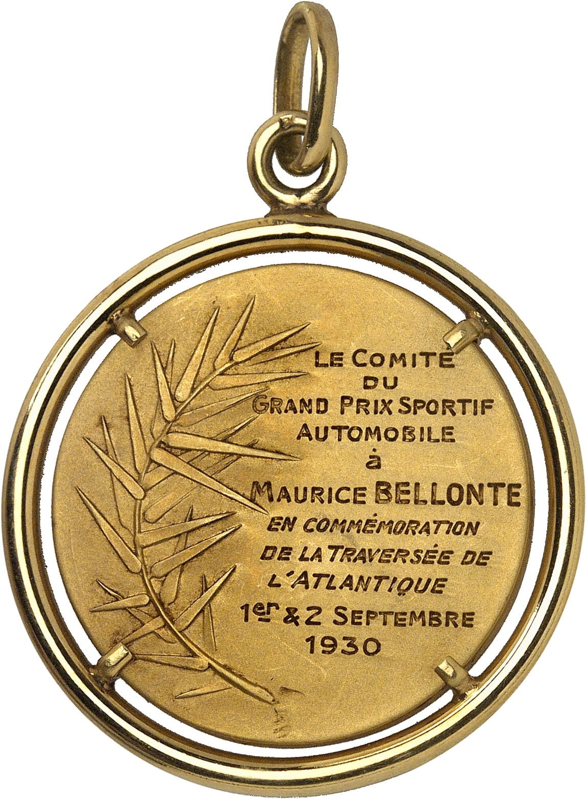 Rv. Attribution à côté d’une palme : LE COMITE / DU / GRAND PRIX SPORTIF / AUTOMOBILE / à / MAURICE BELLONTE / EN COMMÉMORATION / DE LA TRAVERSÉE DE / L’ATLANTIQUE / 1er & 2 SEPTEMBRE / 1930.