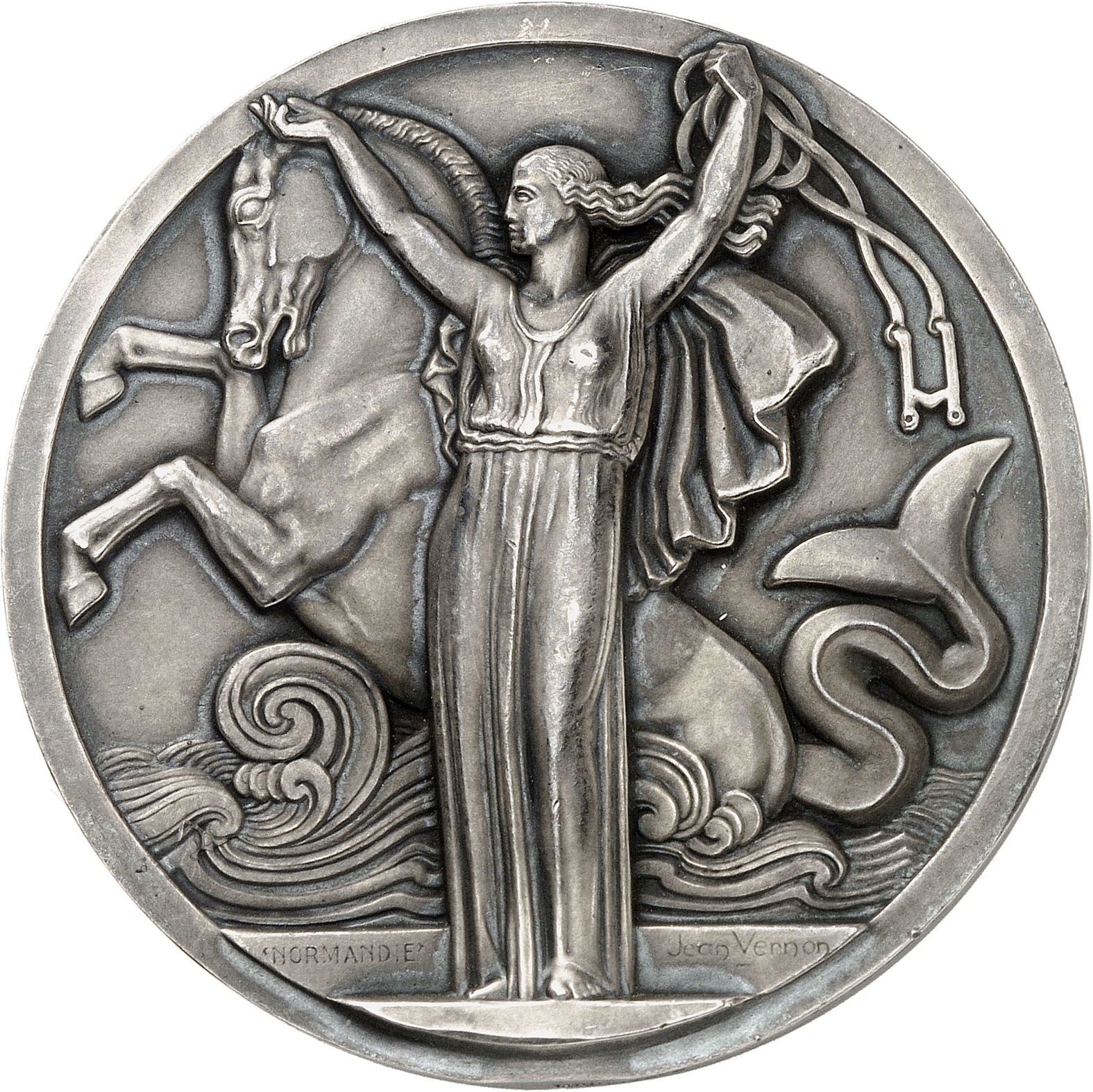 Av. Amphitrite, déesse de la mer, tenant de la main gauche le mors du cheval marin qui surgit derrière elle. À l’exergue : NORMANDIE - Jean Vernon.