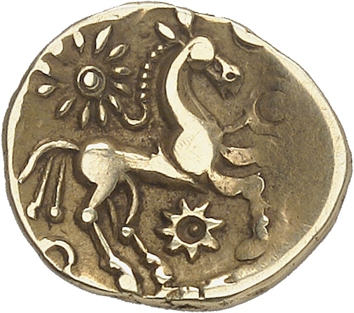 - CELTIC Grande-Bretagne, Regini et Atrébates. Quart de statère dit “de Bognor Cogwheel”, imité des Ambiens et Suessiones ND (c.55-45 av. J.-C.).