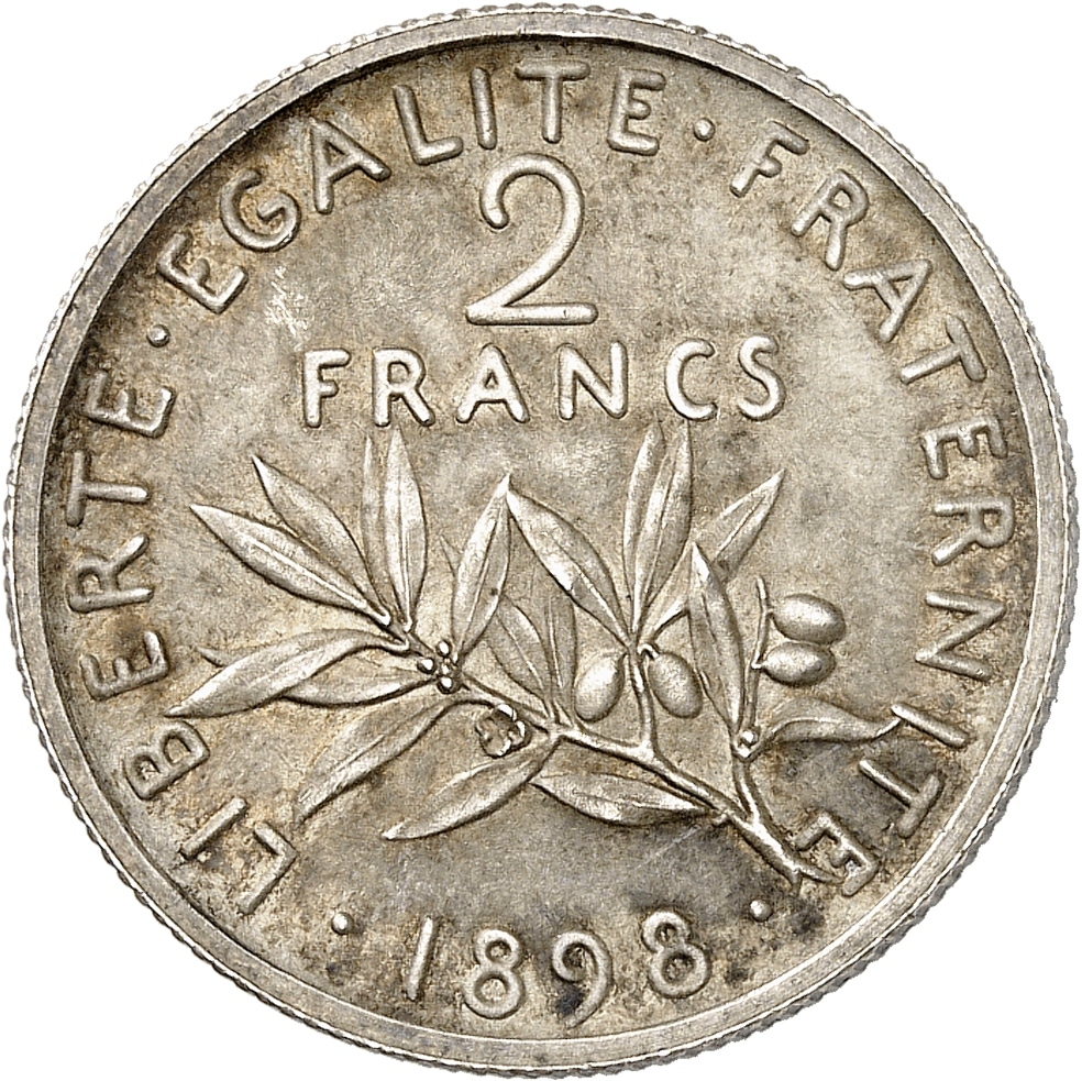 - IIIe République (1870-1940). Présérie (sans ESSAI) de 2 francs Semeuse au gros 2 et tranche cannelée, Frappe spéciale (SP) 1898, Paris.