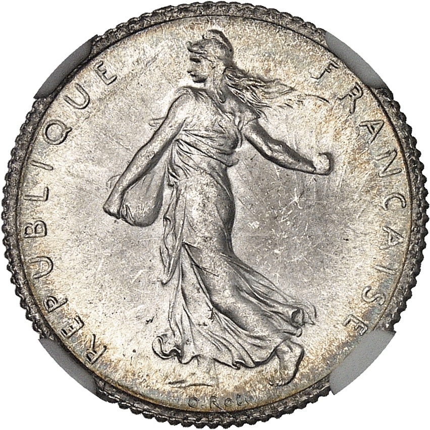 Av. REPUBLIQUE FRANÇAISE. La Semeuse à gauche, avec le soleil levant, marchant et semant à contre-vent ; signature O. ROTY.