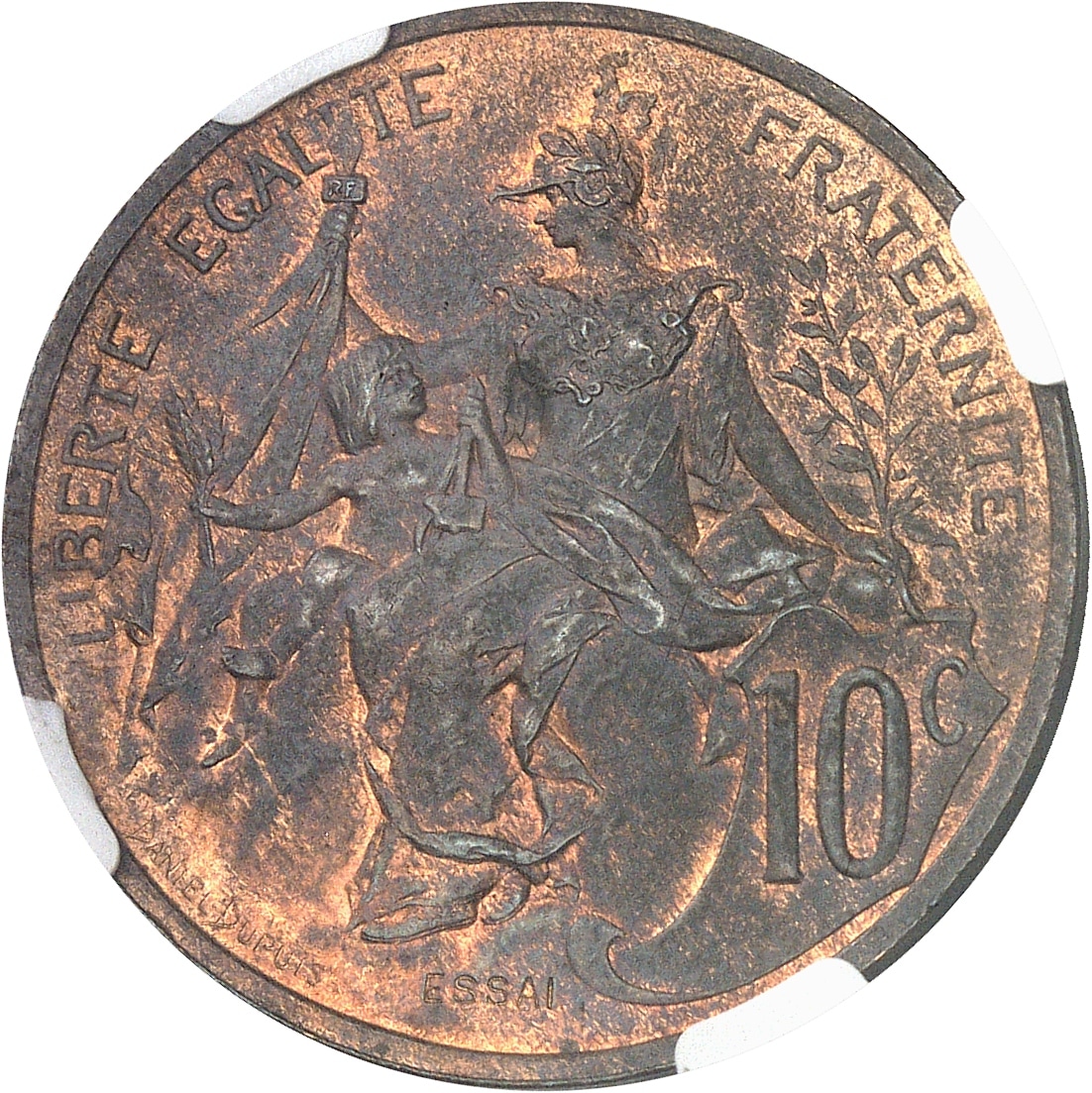 Rv. LIBERTE EGALITE FRATERNITE. La République à gauche, avec un enfant. Cartouche inscrit 10 C et signature DANIEL-DUPUIS, avec ESSAI en creux à l’exergue.