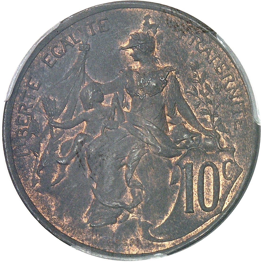 - IIIe République (1870-1940). Essai de 10 centimes Daniel-Dupuis, non daté, avec ESSAI en creux au revers, Frappe spéciale (SP) ND (1897), Paris.