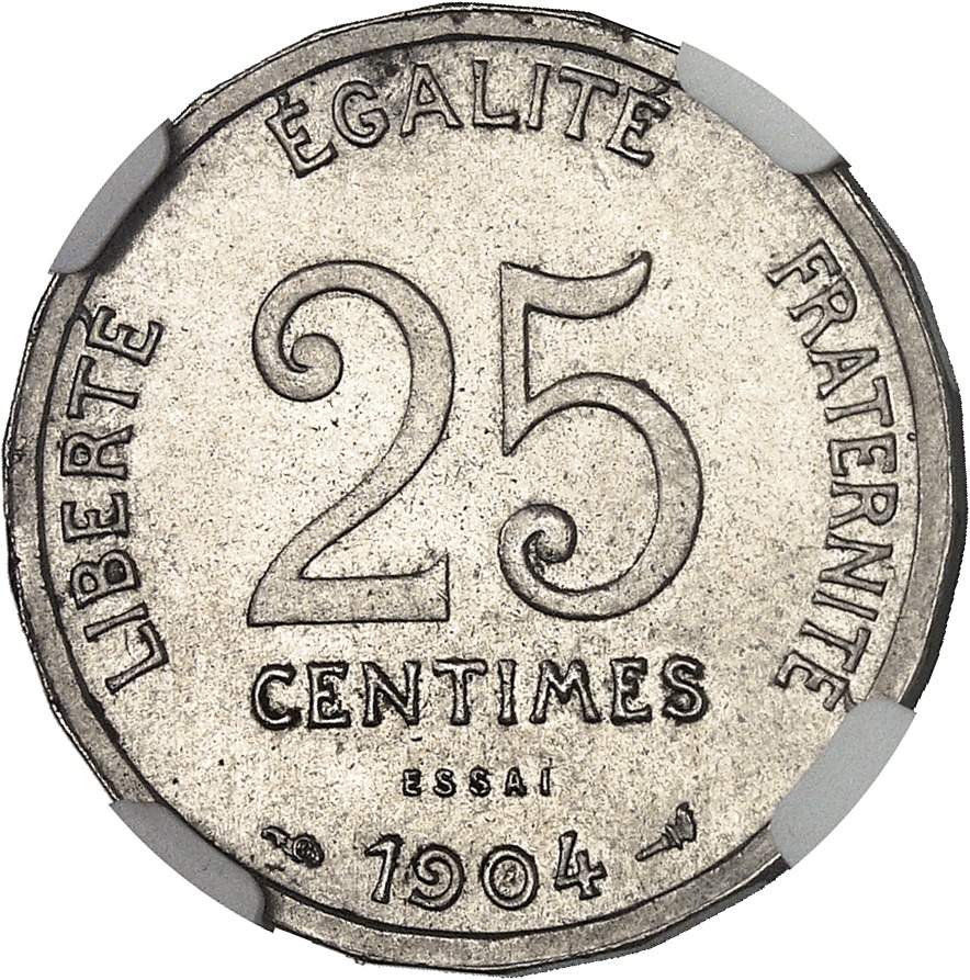 - IIIe République (1870-1940). Essai de 25 centimes Patey, 1er type, sans le carré, flan à 22 pans 1904, Paris.