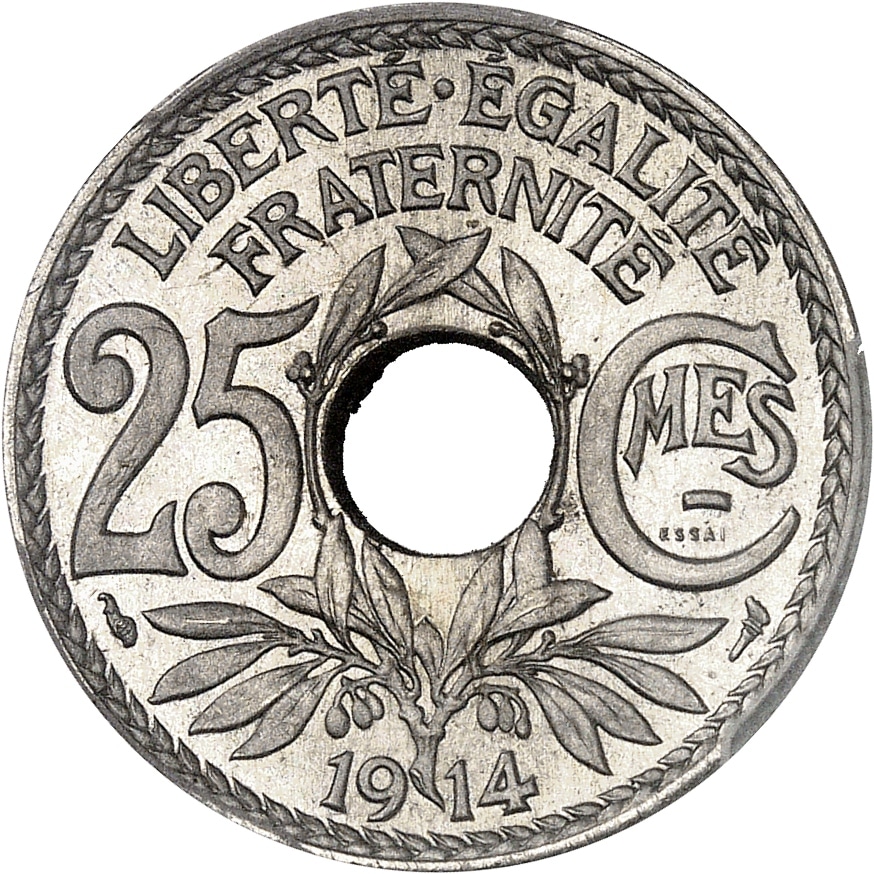 - IIIe République (1870-1940). Essai-piéfort de 25 centimes Lindauer, grand module, en nickel, Frappe spéciale (SP) 1914, Paris.