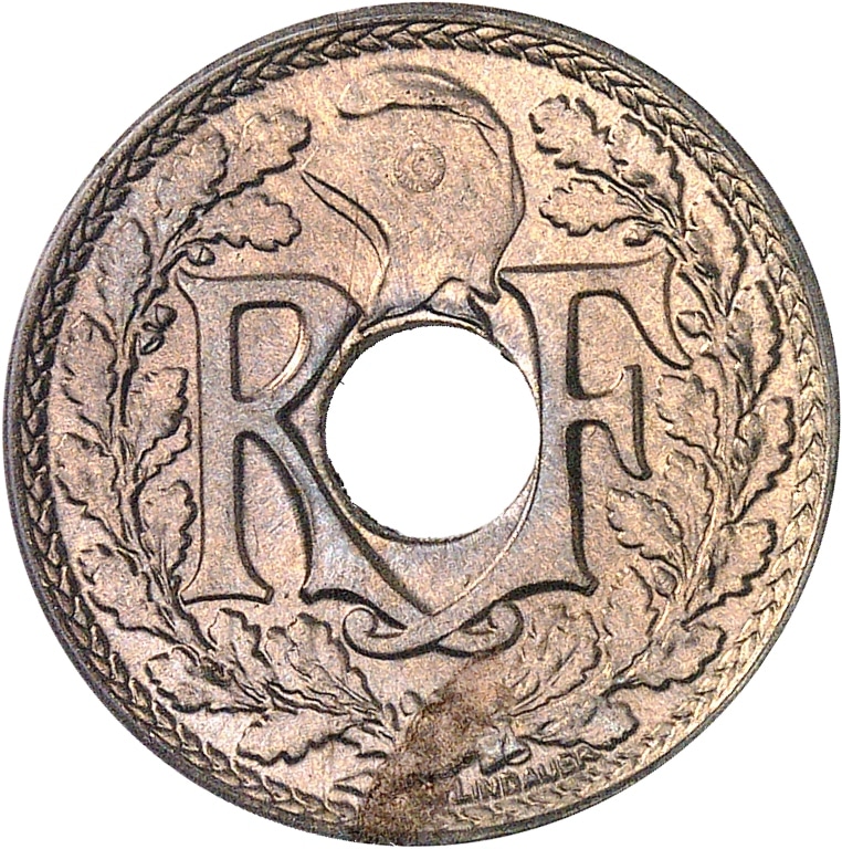 Av. RF autour du trou central surmonté d’un bonnet phrygien, le tout dans une couronne formée de deux branches, signature EM. LINDAUER.