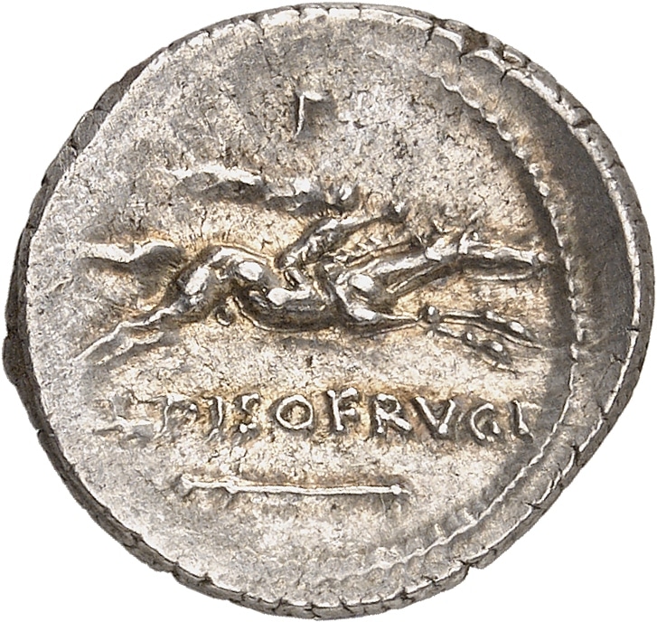 Rv. L PISO FRVGI. Cavalier galopant à droite, tenant une palme ; au-dessus, marque de contrôle.