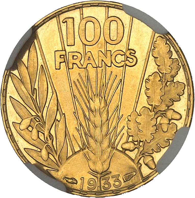 Rv. 100 FRANCS. Épi entre une branche d’olivier et une branche de chêne ; à l’exergue (différents) et (date).