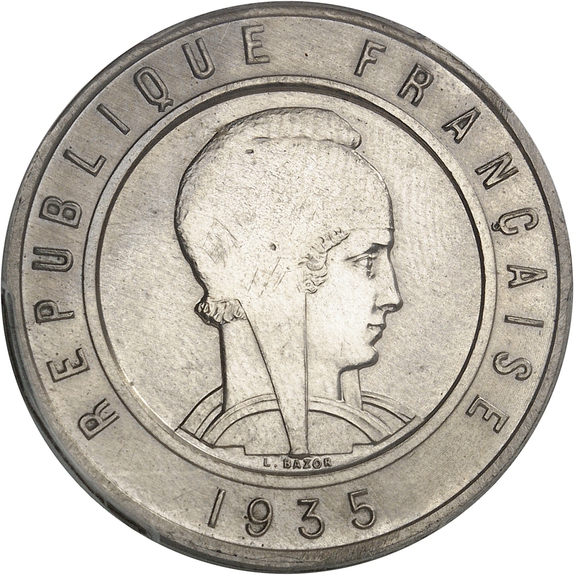 Av. REPUBLIQUE FRANÇAISE / (date). Tête à droite de la République, coiffée d’un bonnet de la Liberté ; signature L. BAZOR.