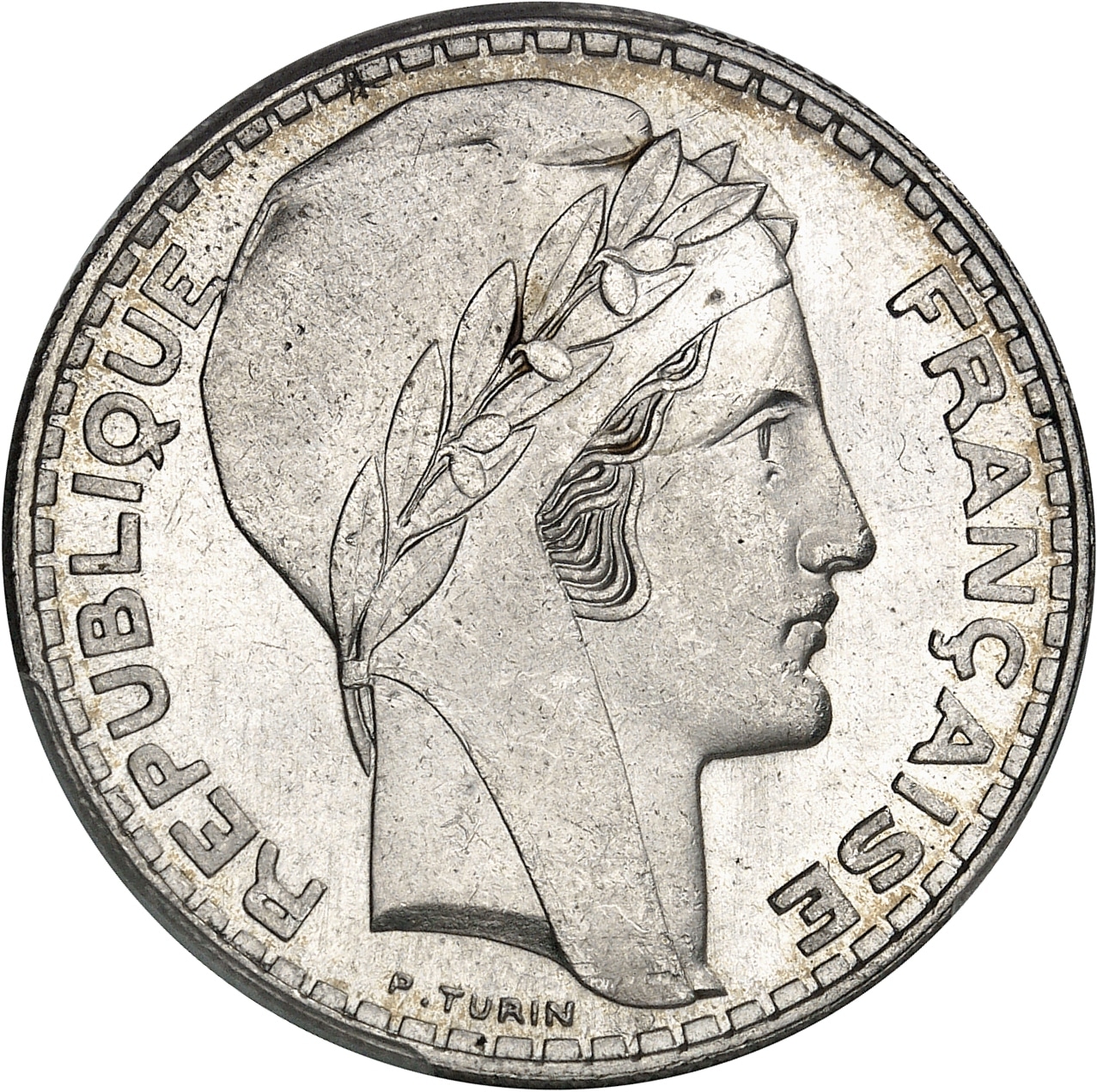 Av. REPUBLIQUE FRANÇAISE. Tête de la République à droite, avec bonnet de la Liberté et laurée ; au-dessous signature P. TURIN.