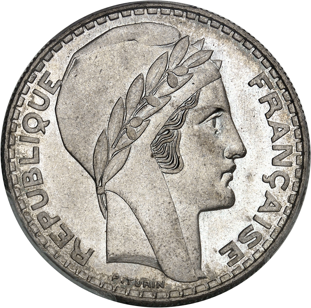 Av. REPUBLIQUE FRANÇAISE. Tête de la République à droite, avec bonnet de la Liberté et laurée ; au-dessous signature P. TURIN.