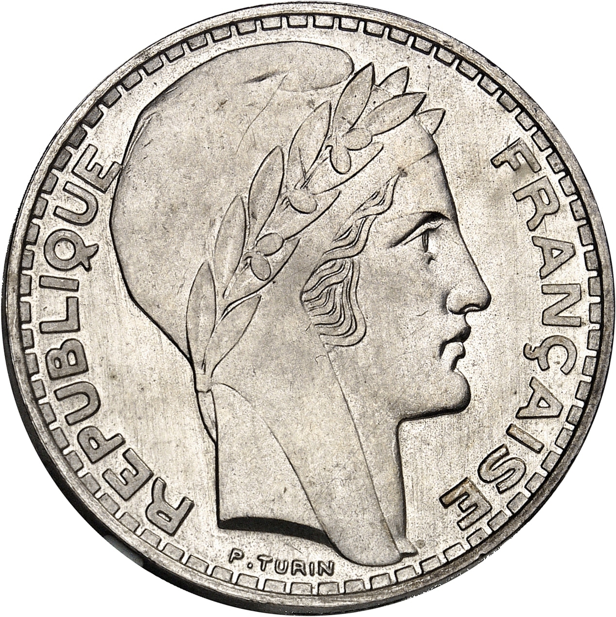 Av. REPUBLIQUE FRANÇAISE. Tête de la République à droite, avec bonnet de la Liberté et laurée ; au-dessous signature P. TURIN.
