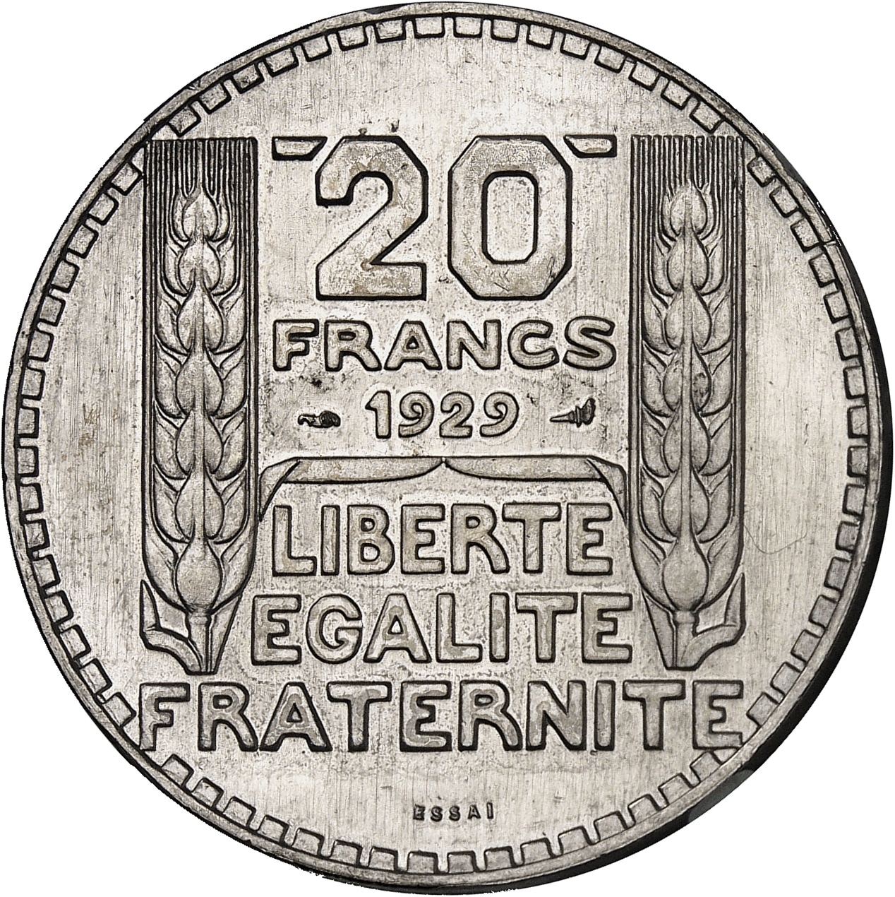 Rv. Entre deux épis : 20 FRANCS (différent) (date) (différent) et LIBERTE/ EGALITE/ FRATERNITE ; à l’exergue ESSAI.