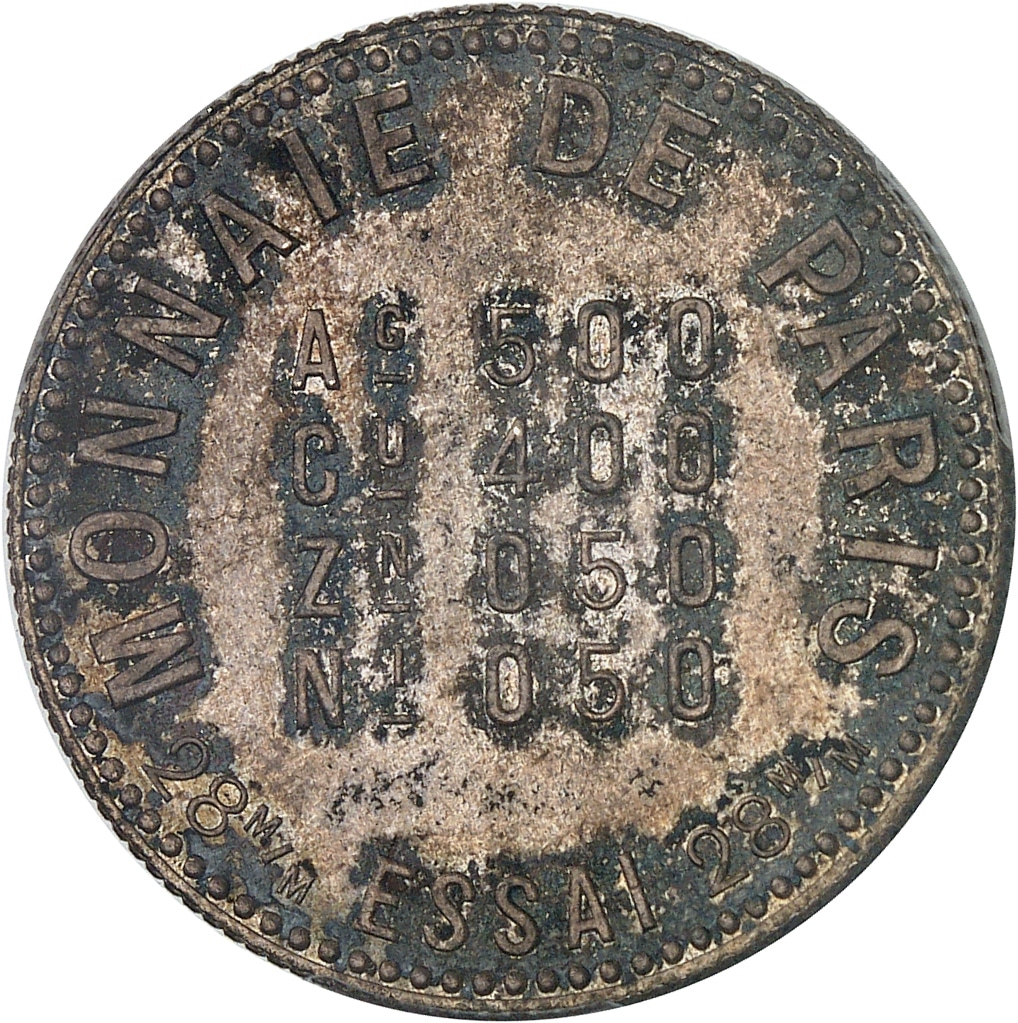 Rv. MONNAIE DE PARIS/ 28 M/M ESSAI 28 M/M. Composition de l'alliage en quatre lignes : Ag 500/ Cu 400/ Zn 050/ Ni 050.
