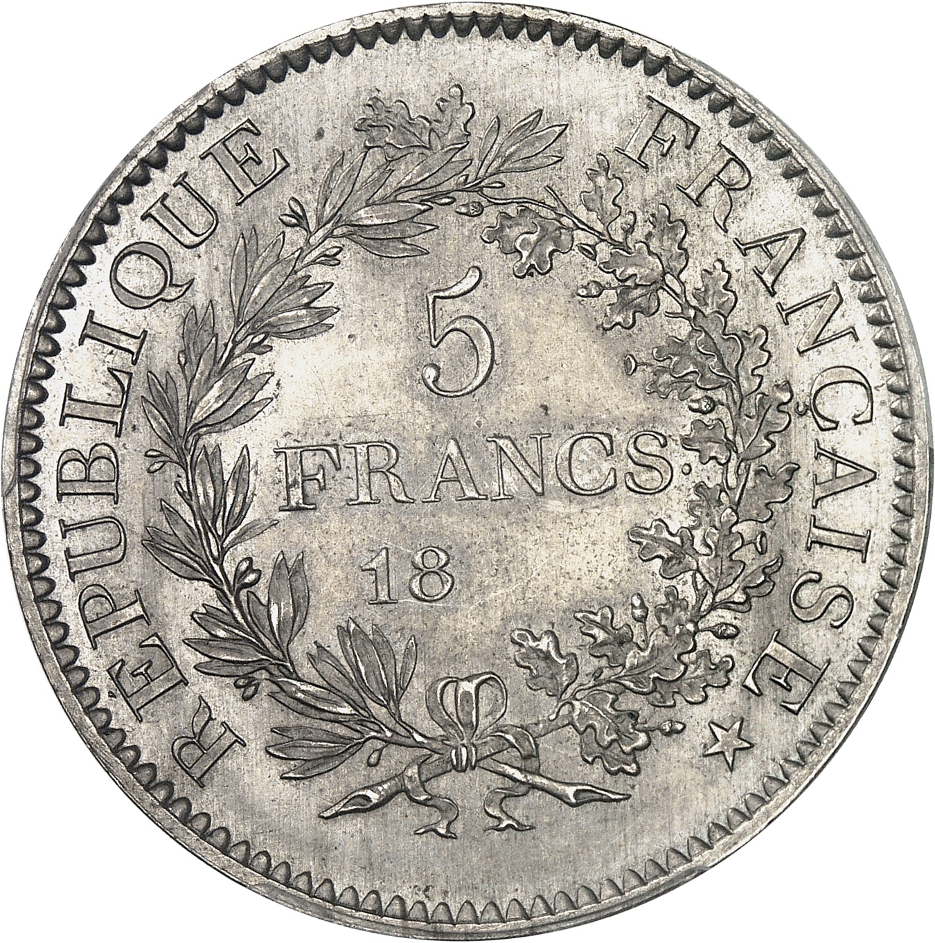 Rv. RÉPUBLIQUE - FRANÇAISE *. Dans une couronne formée d’une branche d’olivier et d’une branche de chêne : 5 FRANCS et 18-- (sans différents, ni atelier).